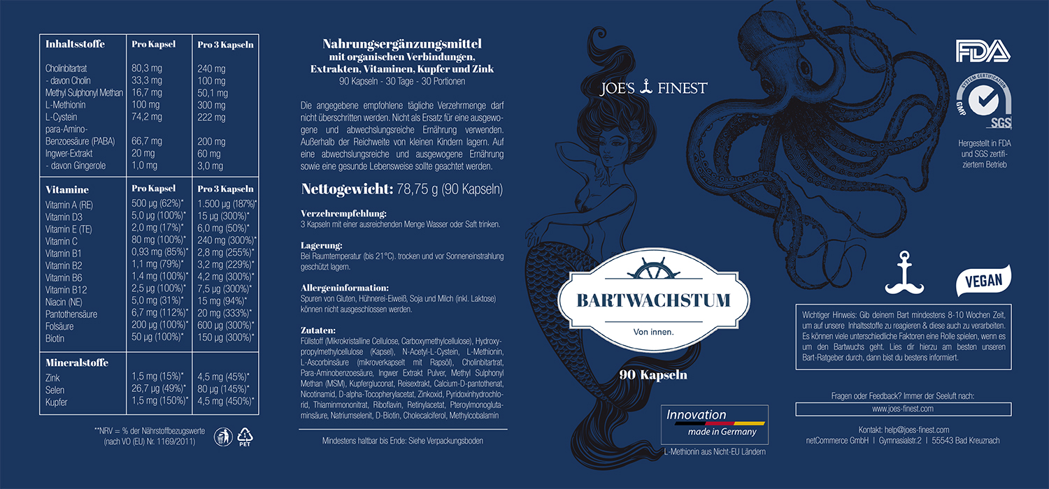 Contents of Joe’s Finest Beard Growth Pills: Filler (microcrystalline cellulose, carboxymethylcellulose), hydroxypropylmethylcellulose (capsule), N-acetyl-L-cysteine, L- methionine, L-ascorbic acid (microencapsulated with rapeseed oil), choline bitartrate, para- aminobenzoic acid, ginger extract powder, methyl sulphonyl methane (MSM), copper gluconate, rice extract, calcium D-pantothenate, nicotinamide, D-alpha-tocopheryl acetate, zinc oxide, pyridoxine hydrochloride, thiamine mononitrate, riboflavin, retinyl acetate, pteroyl monoglutamic acid, sodium selenite, D-biotin, cholecalciferol, methylcobalamin.